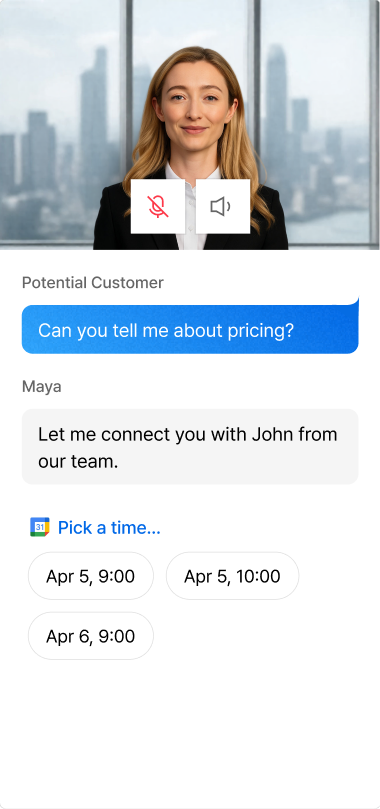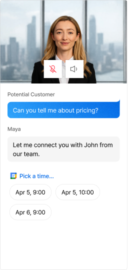 Choose a pre-built avatar or use your team's face and voice. Every conversation stays on-brand.